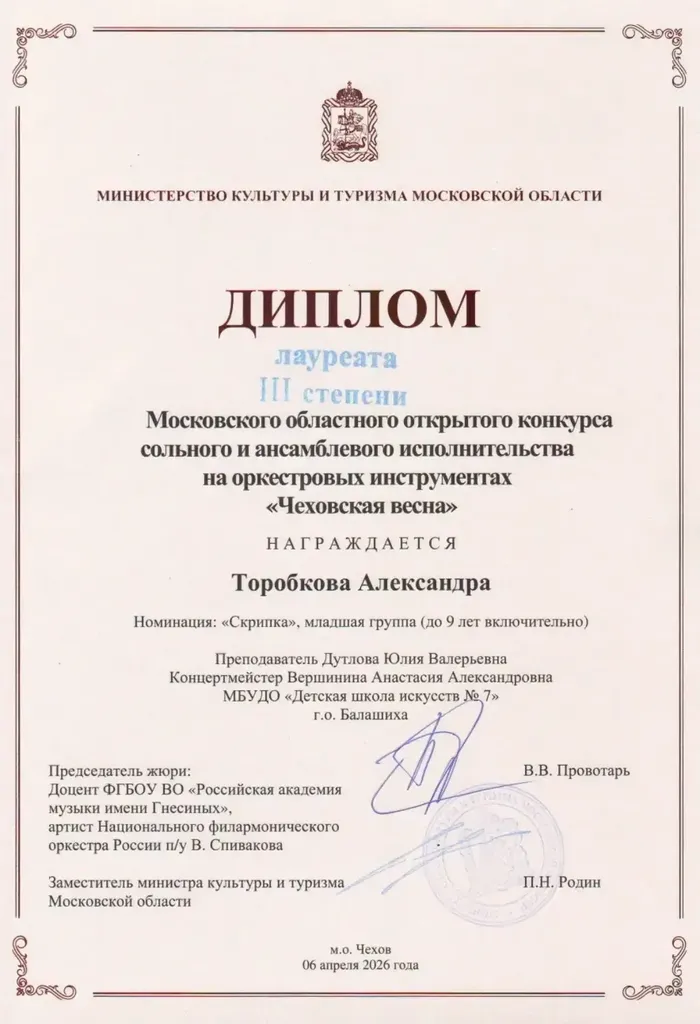 Поздравляем с победой! Торобкова Александра-лауреат III степени Московского областного открытого конкурса сольного и ансамблевого исполнительства на оркестровых инструментах "Чеховская весна" г.Чехов, апрель 2026. Преподаватель - Дутлова Ю. В. концертмейстер - Вершинина А. А.