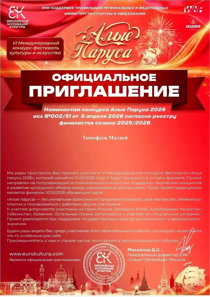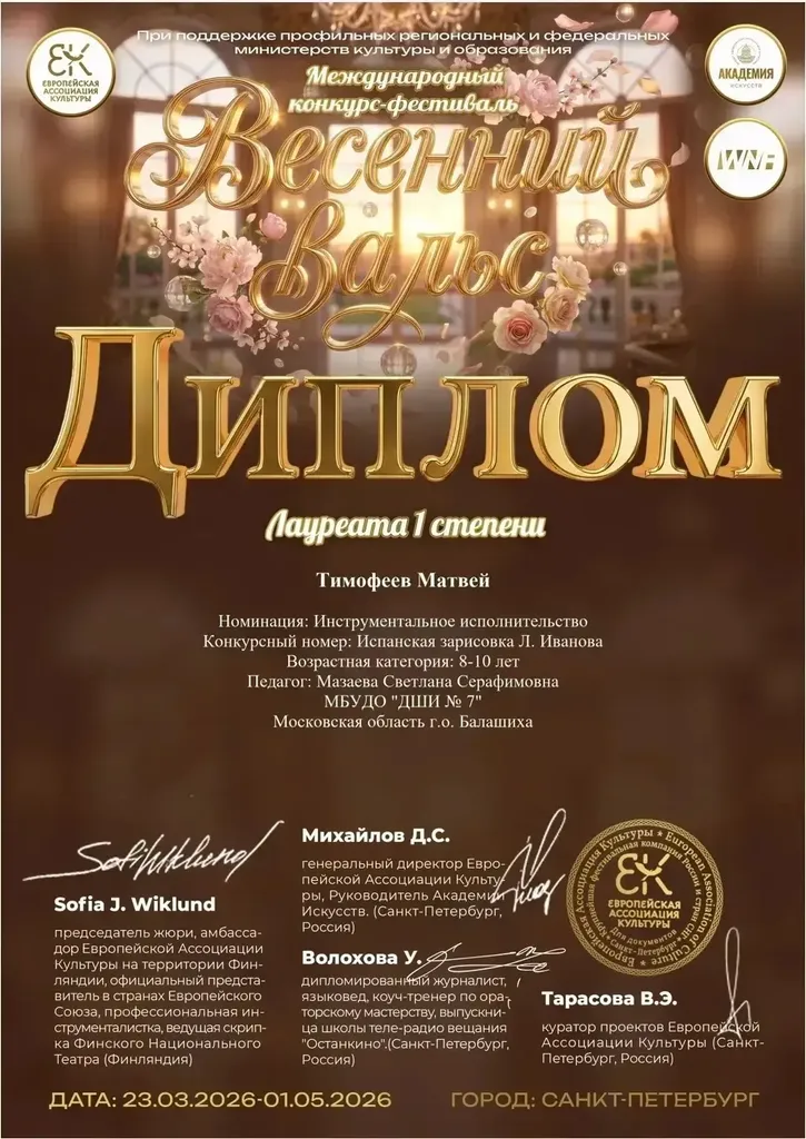 Тимофеев Матвей - лауреат I степени Международного конкурса - фестиваля "Весенний вальс", г.Санкт-Петербург, март-май 2026. А также Тимофеев Матвей стал финалистом сезона 2025-2026 VI Международного конкурса -фестиваля культуры и искусства "Алые паруса", г.Санкт-Петербург, апрель 2026. Преподаватель - Мазаева Светлана Серафимовна.