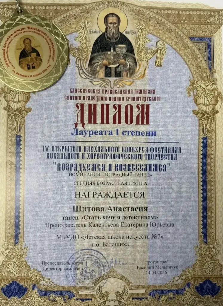 Поздравляем с победой! Солистки хореографического ансамбля "Позитив" (рук. Калентьева Е.Ю.) - Иванова Арина и Шитова Анастасия - лауреаты I степени IV Открытого Пасхального конкурса-фестиваля вокального и хореографического творчества "ВОЗРАДУЕМСЯ и ВОЗВЕСЕЛИМСЯ", апрель, 2026.